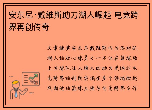 安东尼·戴维斯助力湖人崛起 电竞跨界再创传奇