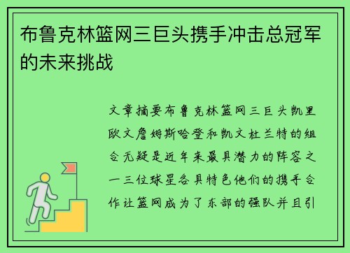 布鲁克林篮网三巨头携手冲击总冠军的未来挑战